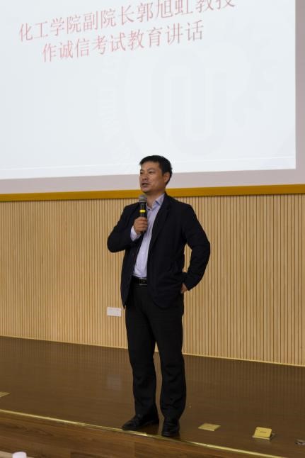 学风建设工作开展情况和今后的规划以及目标,就诚信考试与同学们进行了广泛深入的交流。郭教授以普林斯顿大学为例,介绍了国外知名大学对于加强学生考试诚信的各项措施。以近期考试中舞弊、替考的真实案例,告诫同学们应该秉持诚信应考,端正考试的态度。随后同学们观看了诚信教育考试的宣传视频。2019级辅导员阿曼向同学们解读了《华东理工大学学生考核违规处理办法》(校发[2017] 3号)中关于考试违规违纪相关处分条例。